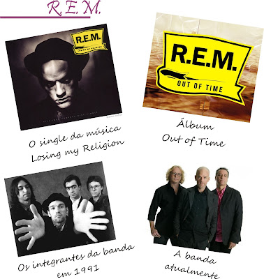 Minha banda de hoje é a R.E.M., e a música você já deve ter uma idéia neh? rsss... Essa eu serei óbvia mesmo, não terá jeito... Pelo menos eu, quando penso em R.E.M. eu penso logo em "Losing my Religion"... Música hiper clássica e que gruda muito na cabeça... Agora vamos para o um pouco de cultura... Já reparei que toda vez que faço essas fotos da banda mais antiga, sempre tem um integrante da banda faltando na foto da banda atualmente, e como nas outras vezes, um deles saiu da banda antes do término no ano passado...